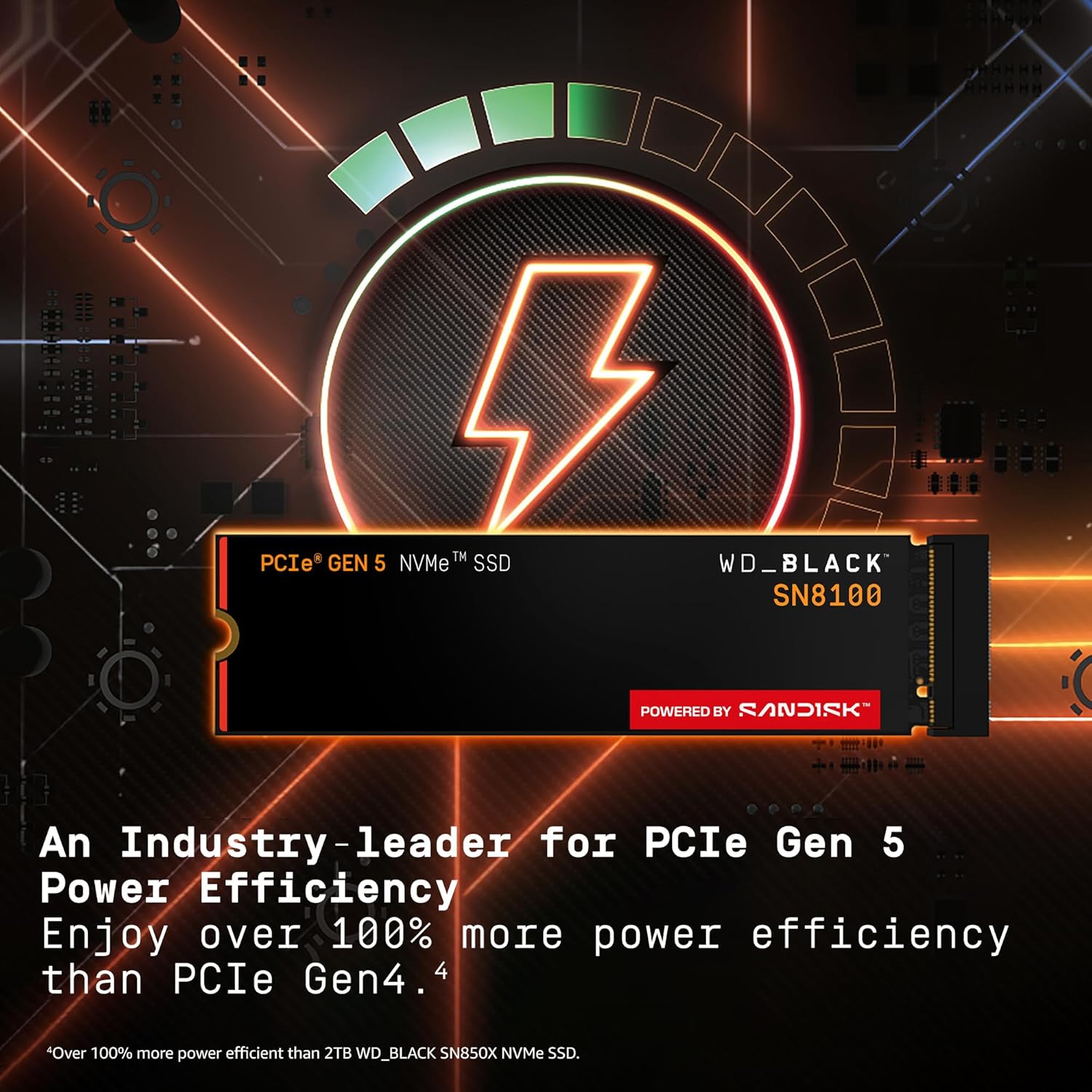 Despite its immense power, the SN8100 is also an industry leader in power efficiency, offering over 100% better efficiency than PCIe Gen4 SSDs and operating at an average of 7W or less, helping keep your system cooler and more efficient.